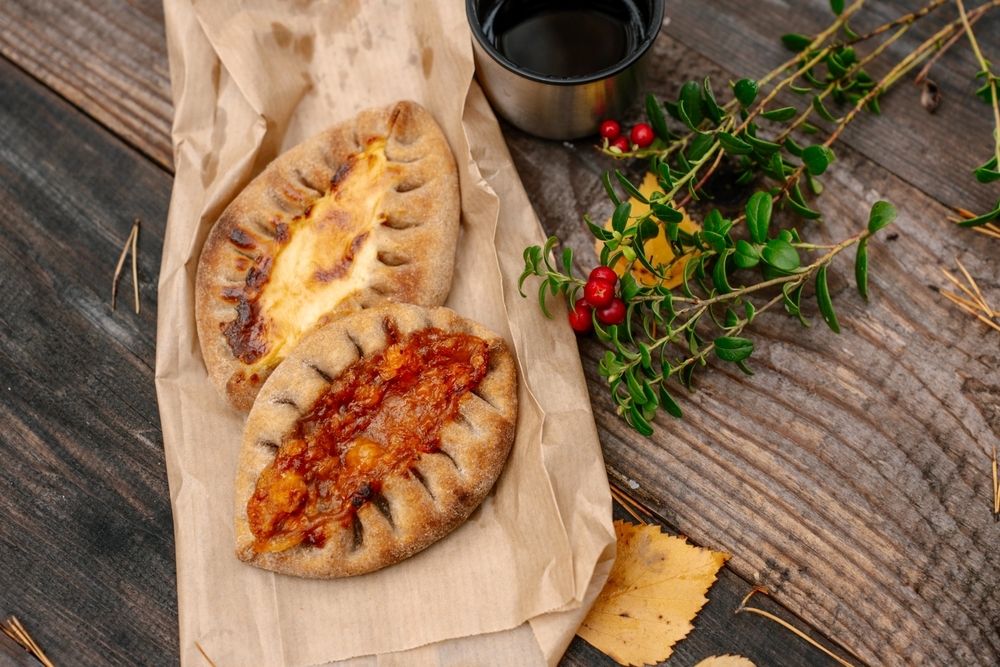Калитки с разной начинкой — это местная национальная выпечка. Брусничный морс. Держите себя в руках и не лопните до десерта: пироги с ягодами здесь удивительно вкусные.