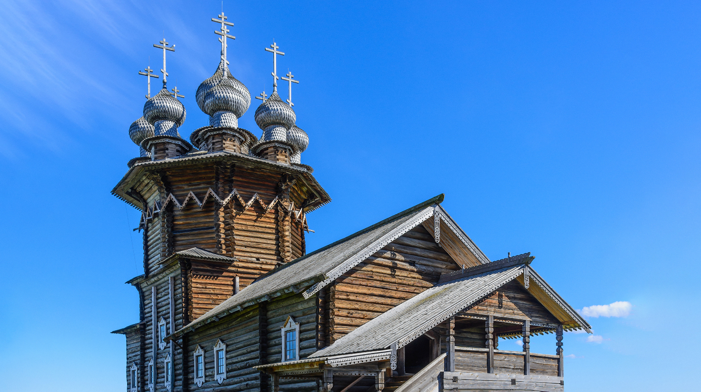 Церковь Преображения Господня. Преображенская церковь — символ Кижей. Она увенчана 22 главками, размещенными ярусами на кровлях прирубов и восьмериков. Форма и размеры глав меняются по ярусам, все вместе создают удивительную гармонию. Построена в 1714 году, по одной из легенд — одним топором (без гвоздей), который потом мастер выбросил в озеро. На самом деле гвозди есть — в куполах.