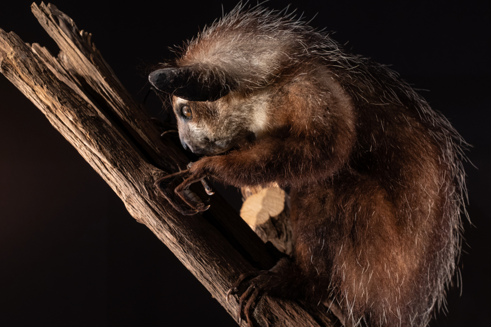 У зверька огромные уши, которые помогают ему улавливать движения насекомых в стволах деревьев. Зубы, как у грызунов, не перестают расти.