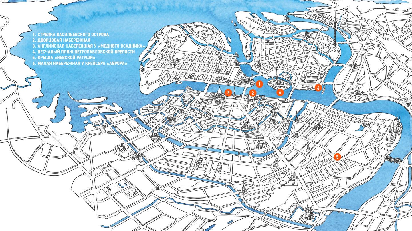 С высоты 45 м открывается панорама четырех мостов: Литейного, Троицкого, Дворцового и Биржевого. Перед рассветом над Невой стелется «речной туман», и опоры кажутся растворенными в воздухе. А в 02:30 город превращается в макет с движущимися световыми точками катеров.