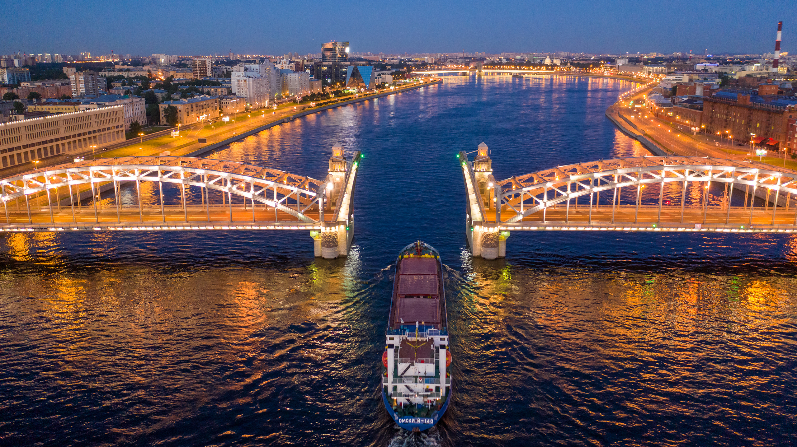 Символ Петербурга, соединяющий Адмиралтейский остров со Стрелкой Васильевского острова. Его двукрылый пролет шириной 56,5 м поднимает 700-тонные конструкции, создавая силуэт, знакомый по открыткам.