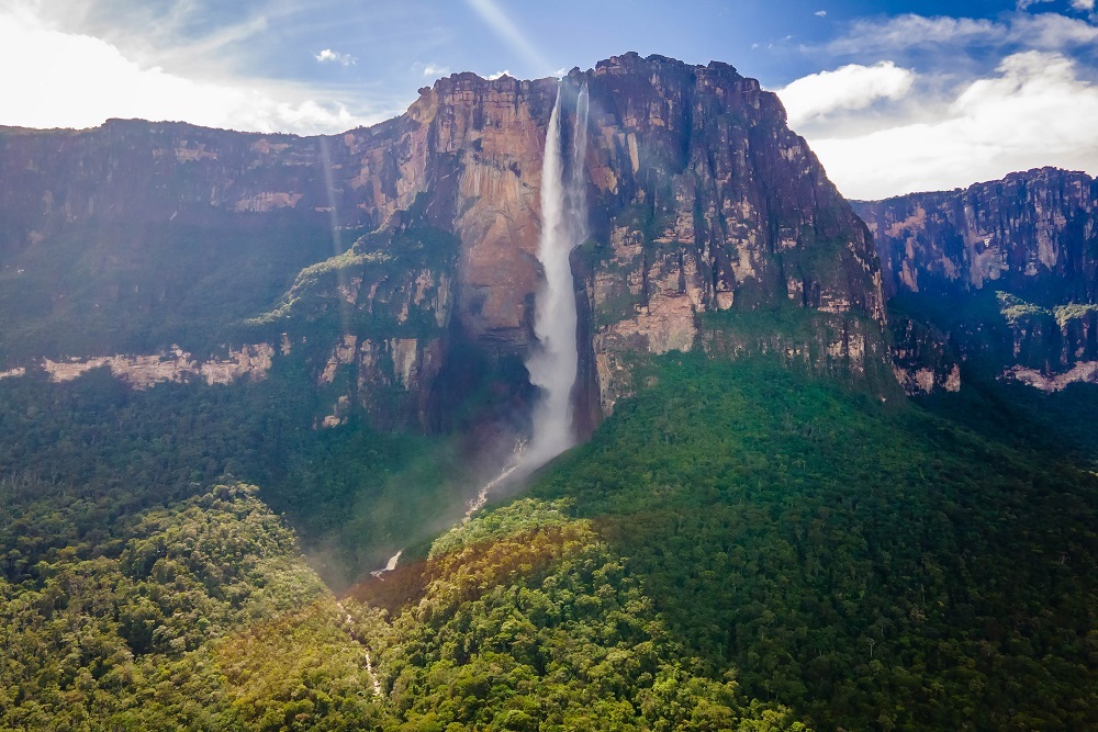 Южноамериканский водопад Анхель по праву входит в топ самых грандиозных водопадов мира, ведь он самый высокий из них. Его образовал поток, падающий с горы Ауян-Тепуи в тропических лесах Венесуэлы. Высота его составляет впечатляющие 979 м, однако Анхель не очень широкий — всего 107 м. Каждую секунду через водопад проходит 300 м³ воды из реки Кереп.