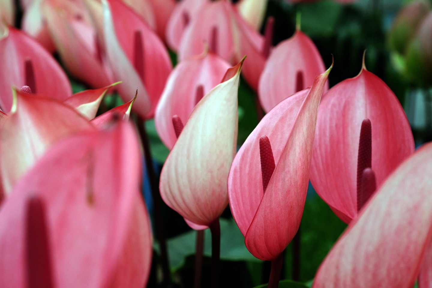 Антуриум, известный как «цветок фламинго», привлекает внимание своими блестящими, ярко окрашенными покрывалами, которые окружают соцветие-початок. Цветовая гамма варьируется от белого и розового до насыщенно-красного и даже фиолетового. Глянцевые листья антуриума придают растению дополнительную декоративность.