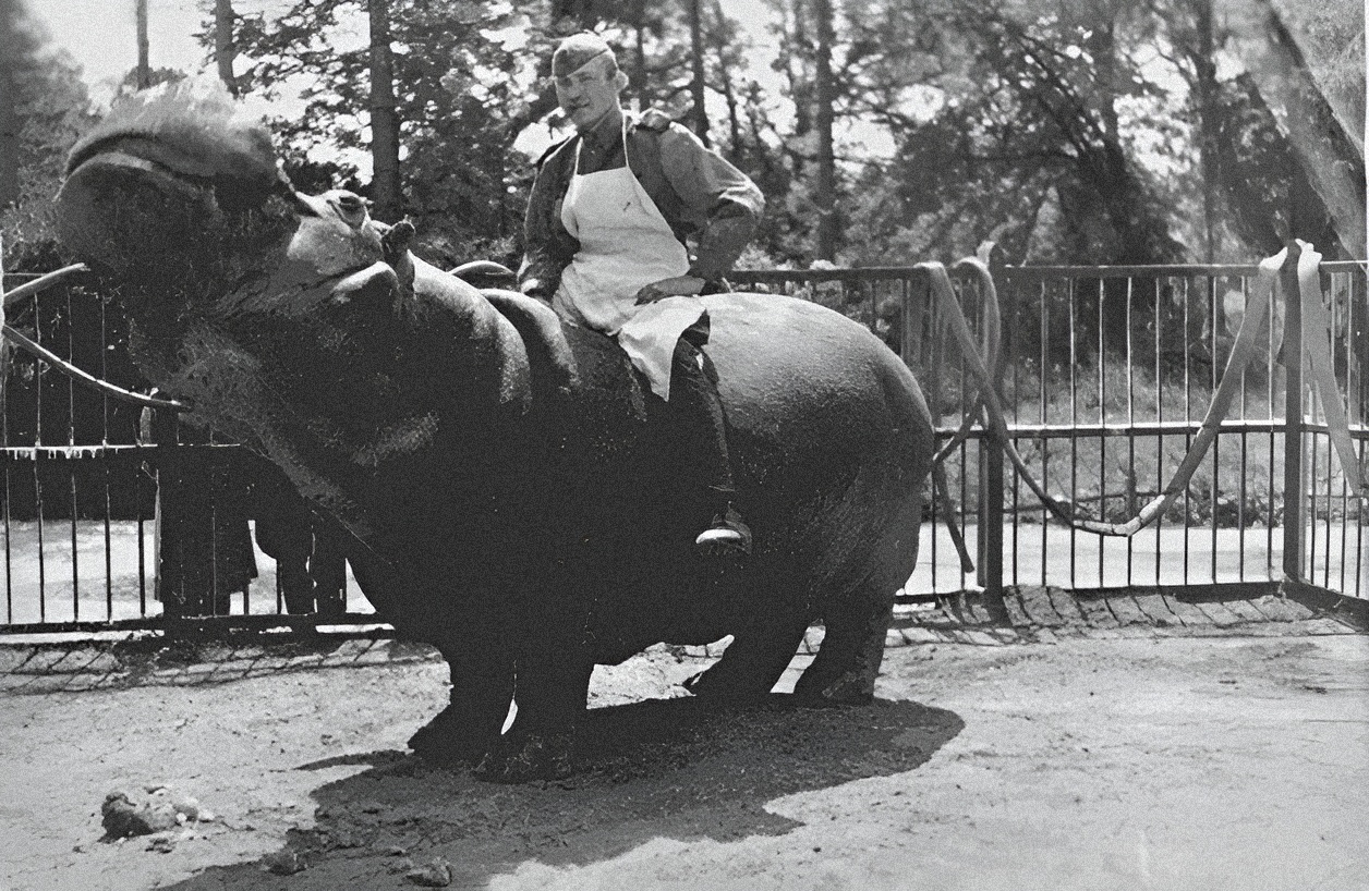 Полковник Василий Теслин, командированный в помощь военному коменданту города, был очевидцем непростой истории отношений людей и бегемота Ганса. Позднее он вспоминал, как однажды беседовал с приехавшими представителями Академии наук, озабоченными сохранением культурных ценностей. Тут влетел шофер Семен: «В зоопарке стрельба! Наши за зверьем гоняются... Сейчас собираются мочить какую-то свинью... Она в луже лежит, огромная, раза в три больше дивана. Хрюкает! Морда — во! На Геринга похожа. Наши как раз ей трибунал зачитывают, щас будут расстреливать по законам военного времени!»