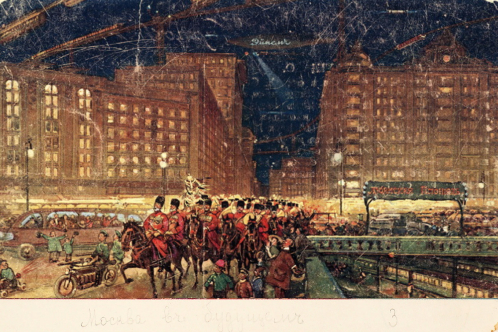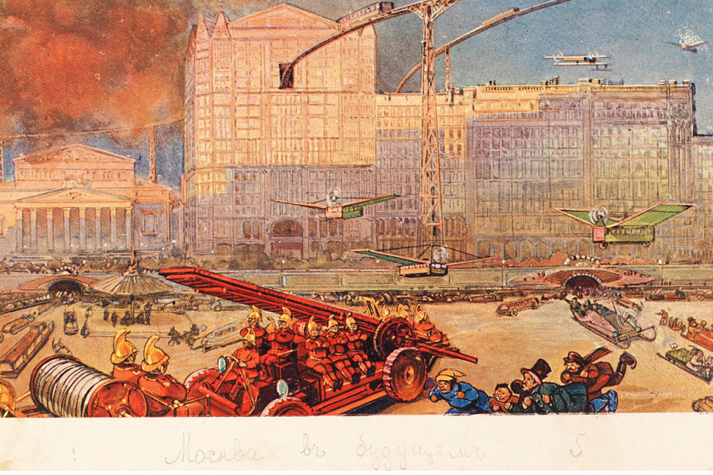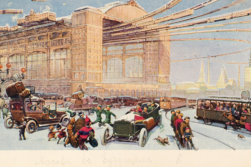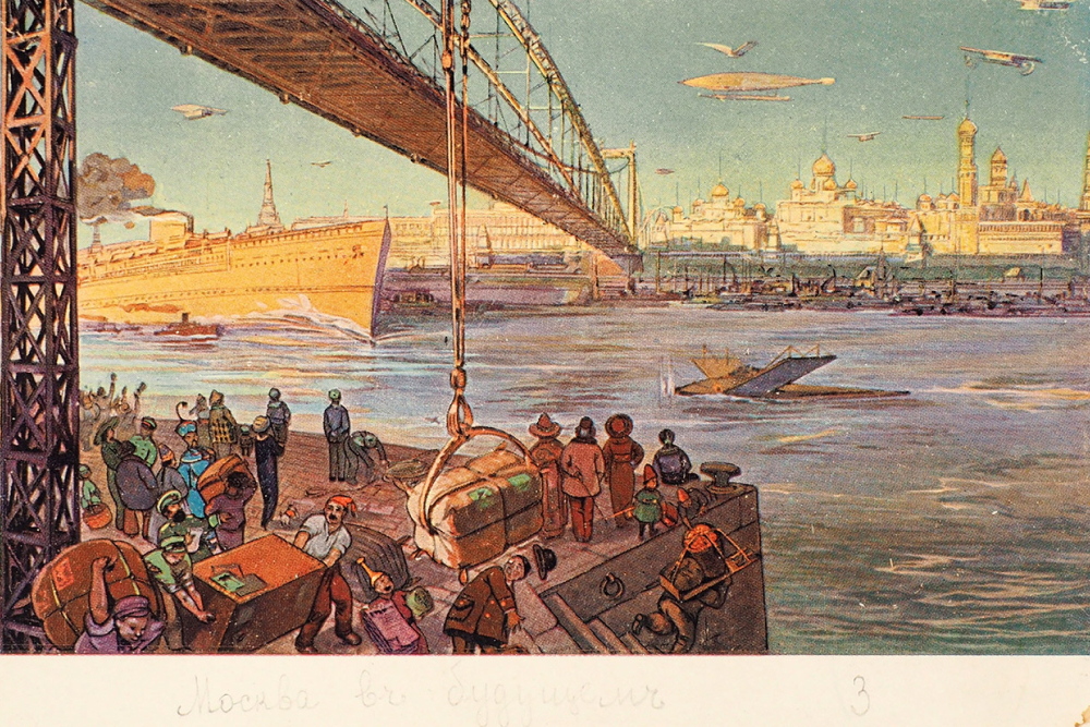 Идея открыток с предсказаниями в конфетах была подхвачена и воплощена в Москве в 1914 году: на кондитерской фабрике «Товарищества Эйнем» (ныне «Красный Октябрь») стали выпускать продукцию с названием «Москва будущего» с приложением в виде соответствующей почтовой карточки. Вся серия состояла из восьми футуристических открыток и сопровождалась описаниями того, что будет с «матушкой-Москвой» через 200–300 лет. Если верить предсказателям с шоколадной фабрики, то через век-полтора россиян ожидает экологически чистое будущее: «Лишенный микробов и пыли, совершенно чистый воздух прорезывают дирижабли и аэропланы… Зима, такая же, как и при нас 200 лет назад. Снег такой же белый и холодный», «Петербургское шоссе целиком превращено в кристально-ледяное зеркало, по которому летят, скользя, изящные аэросани». «Центральный вокзал воздушных и земных путей сообщения» доставляет пассажиров по земле и воздуху «с быстротою телеграмм». Москва-река превратится в мировой торговый порт с прозрачной водой и будет служить только для мирных кораблей, военные корабли будут упразднены за ненадобностью.