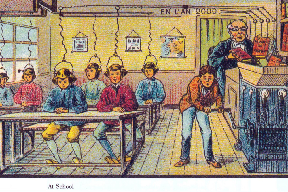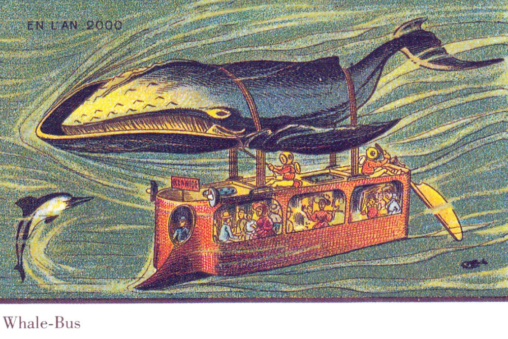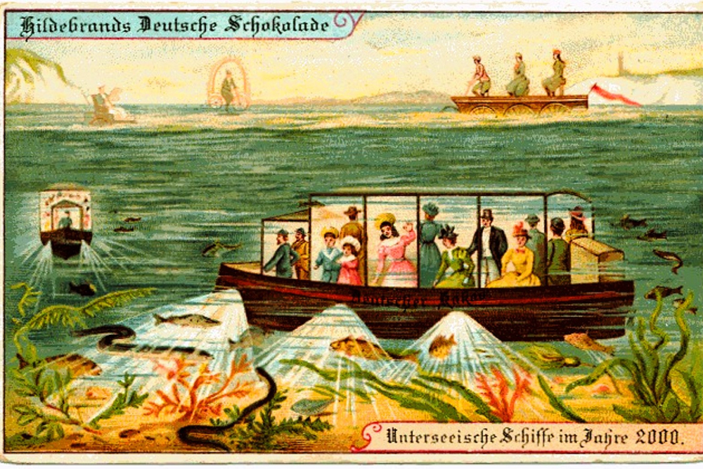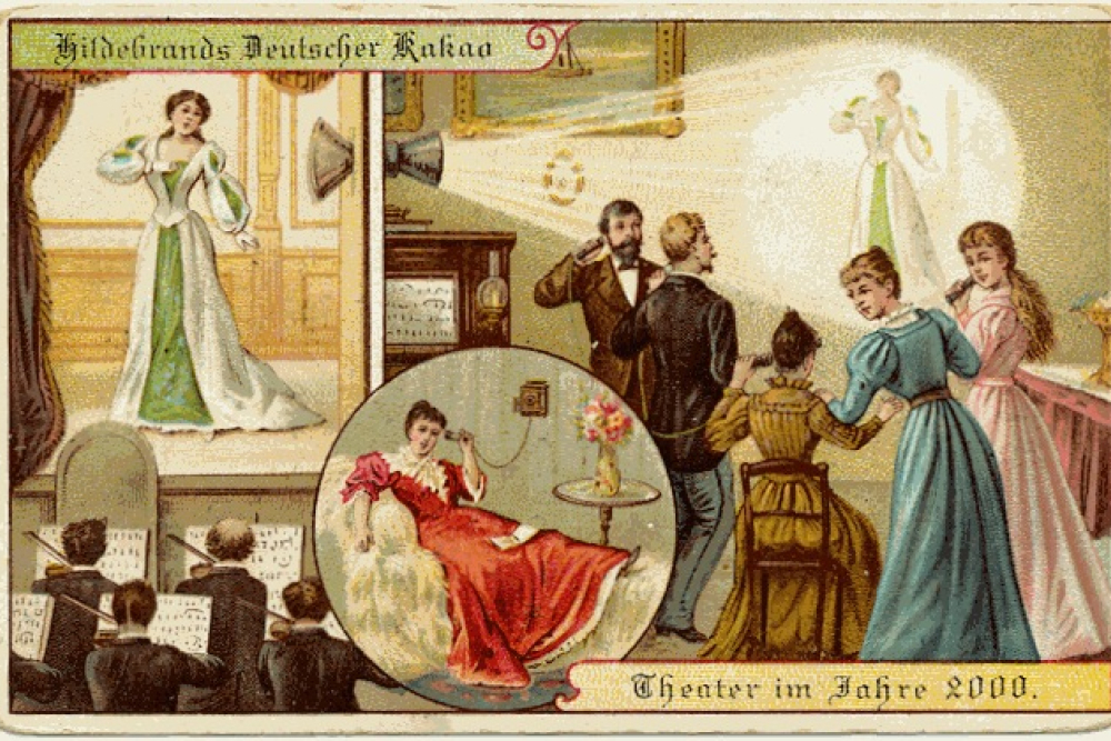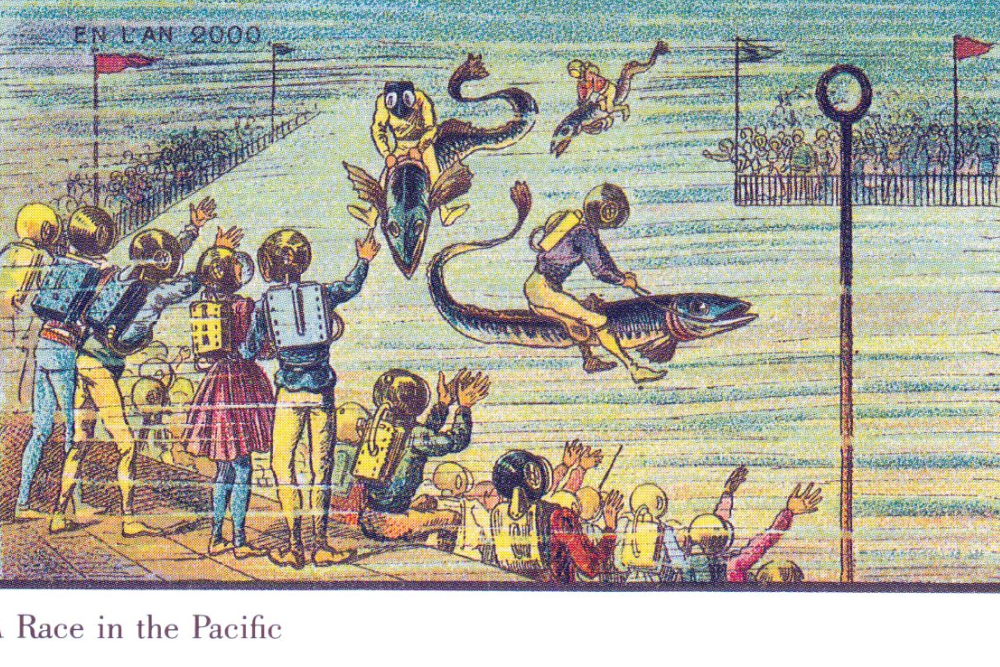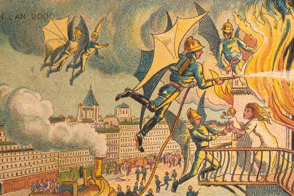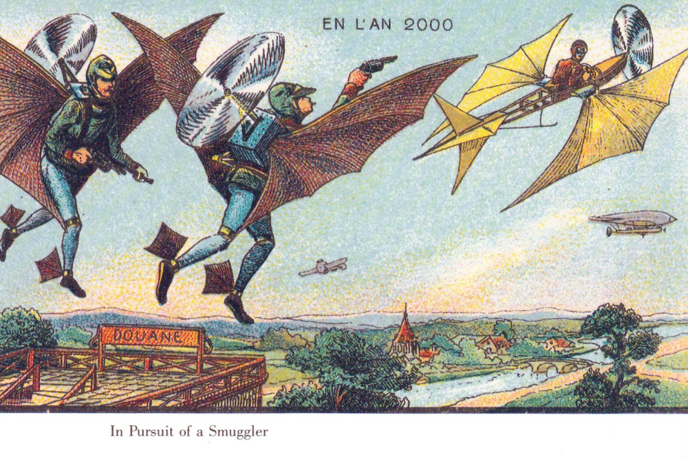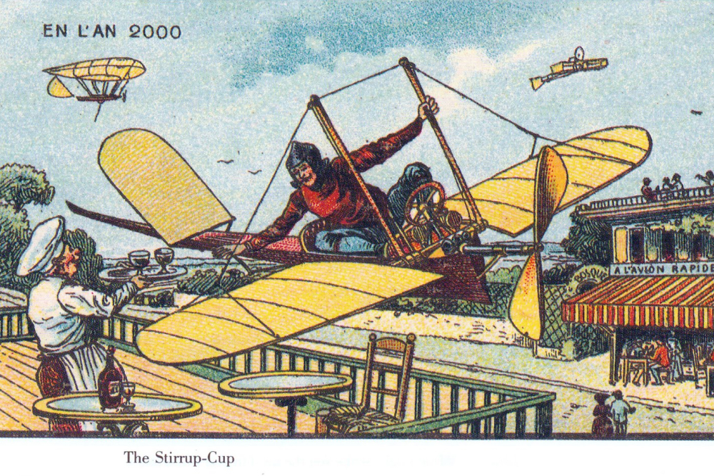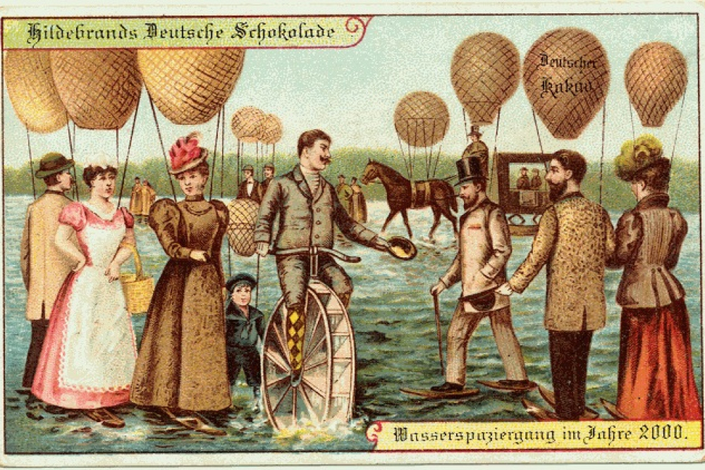 В 1899 году во Франции были изготовлены открытки с предсказаниями, посвященные 2000 году. Зарисовки о будущем придумывал художник Жан-Марк Коте и его коллеги. Первая партия предназначалась для Всемирной выставки в Париже, которая проходила в 1900 году. Всего в период с 1899 по 1910 год была издана целая серия карточек под названием «В 2000 году», из нее до наших дней дожили 87 изображений. Поначалу открытки-предсказания помещались в коробки с сигарами, а после разорения фирмы — в продукцию фабрики игрушек. В воображаемом французском будущем сложную работу за людей делают роботы, в то время как люди весело и разнообразно организуют свой досуг: путешествуют на летающих видах транспорта, любуются рыбами сквозь иллюминаторы подводных лодок, катаются на поезде Париж — Пекин, занимаются экстримом на водных лыжах и роликах, обмениваются голосовыми и видеосообщениями с помощью футуристических гаджетов.