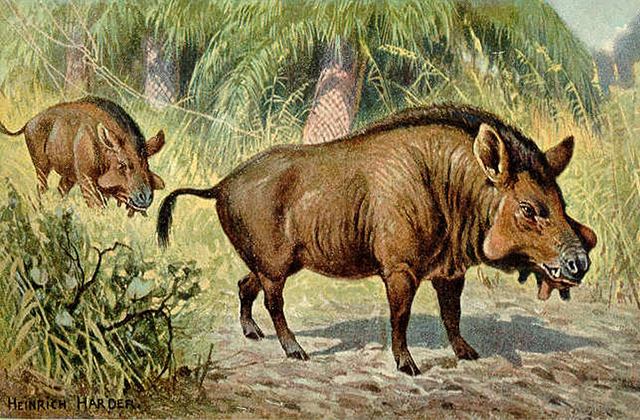 Энтелодон, обитавший 37,2–16,3 млн лет назад в Азии, Европе и Северной Америке, попал в наш рейтинг из-за своего устрашающего вида. Как удалось выяснить исследователям, внешне эти животные были схожи со свиньями. Размеры энтелодона сопоставимы с бегемотом (около 2 м в высоту и 1 т весом). Свирепые хищники с почти 20-сантиметровыми клыками не брезговали поедать своих сородичей, так что наверняка и человек пришелся бы им по вкусу.