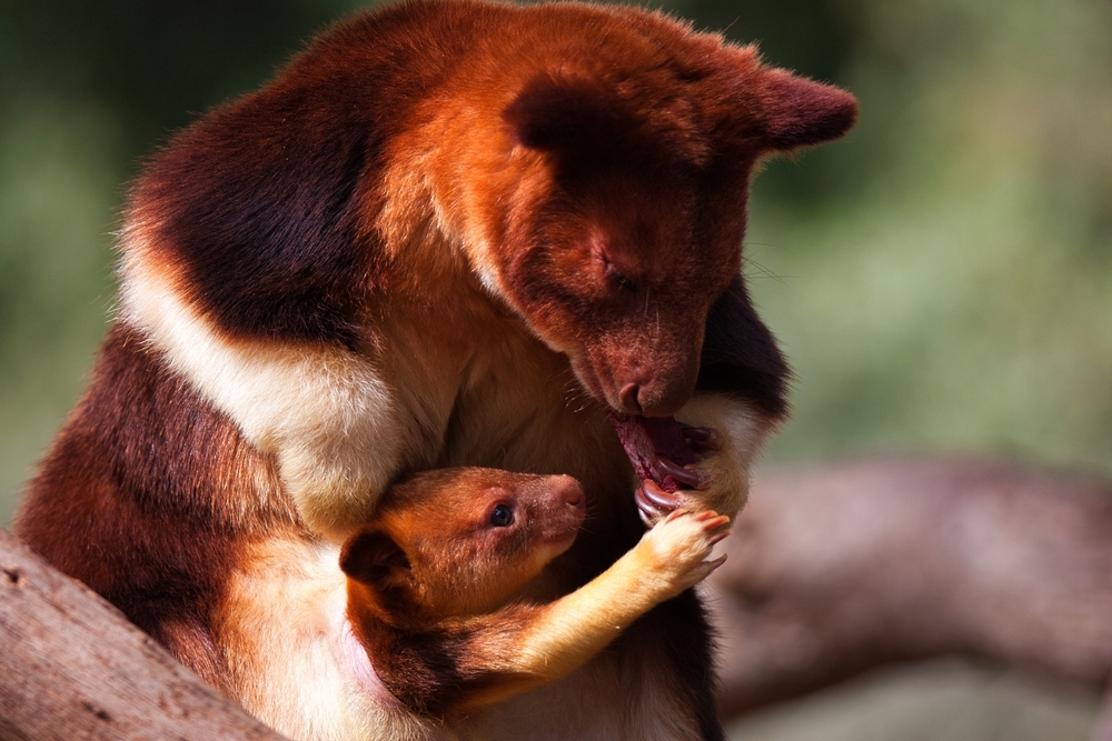 Сумчатые млекопитающие всегда возбуждают любопытство из-за принципиально другого способа размножения. После очень короткой беременности — от восьми дней до одного месяца — на свет появляется детеныш, размер которого не превышает 2,5 см, а вес — 5 г! Едва появившись из родового отверстия, малыш начинает трудный путь: пульсирующими движениями он подталкивает свое тело вперед, а передними лапками крепко цепляется за шерсть матери. В пути он активно вертит головой, улавливая нужный запах. Забравшись в сумку, детеныш хватает сосок, который у него во рту «разбухает», чтобы малыш не оторвался. Первое время детеныш не может даже сосать молоко, самка впрыскивает его в рот младенцу при помощи специальных мышц. В мамином кармане сумчатые проводят по несколько месяцев. Так, детеныши опоссума покидают сумку только спустя два с половиной месяца после рождения, а кенгурята могут задержаться до восьми.