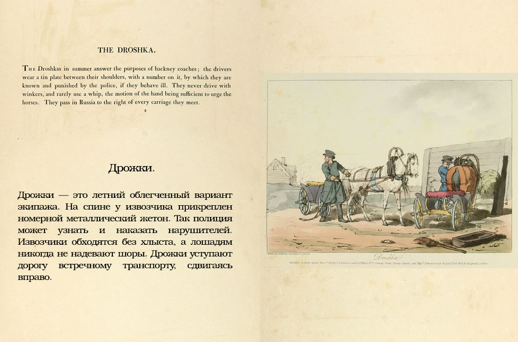 Джон Огастес Аткинсон приехал в Россию еще ребенком, обучился здесь искусству живописи и гравюры и много лет работал при дворах Екатерины II и Павла I. В 1803–1804 годах Аткинсон и его опекун и учитель Джеймс Уокер издали в Великобритании три альбома с офортами, изображающими население и сцены быта России на рубеже XVIII–XIX веков, — A picturesque representation of the manners, customs, and amusements of the Russians. Гравюры имели подписи на французском и английском языках и быстро разошлись по Европе. Мы перевели для вас то, что Джон Аткинсон и его коллега сочли нужным сообщить европейцам. Сам альбом сейчас можно найти в Государственном Эрмитаже и в Российской национальной библиотеке. Первая часть альбома доступна по ссылке.