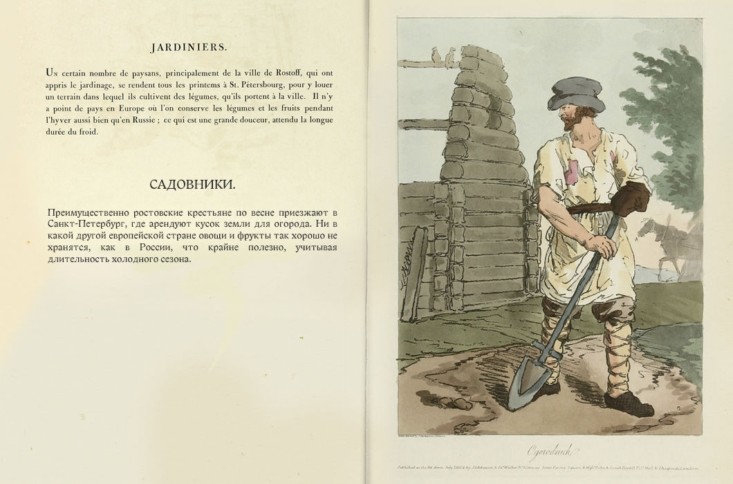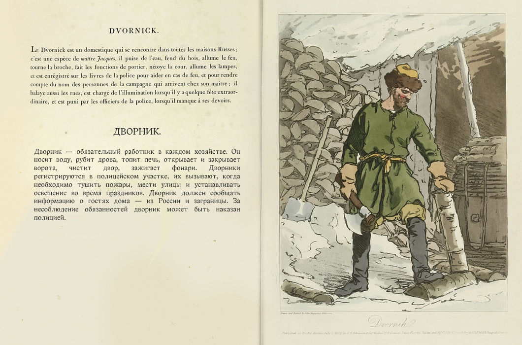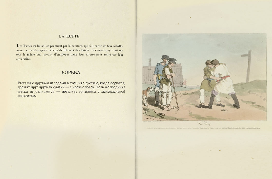Со свойственной англичанам скрупулезностью Джон Аткинсон, российский придворный живописец британского происхождения, протоколирует жизнь русского крестьянина и кочевого татарина, задумчивого финна и разудалого цыгана — всех тех, кто составлял в начале XIX века Российскую империю. В альбомах, которые мы публикуем, нашли отражение дамские наряды и русские ремесла, народные забавы и традиции быта. Именно здесь вы увидите, как выглядел бондарь и калачник, чем отличается телега от арбы, а кулачный бой от бокса. Аткинсон объективно рассказывает об особенностях русской бани и особенностях русского же азарта, широте русской души и ее же страсти к темным делишкам.